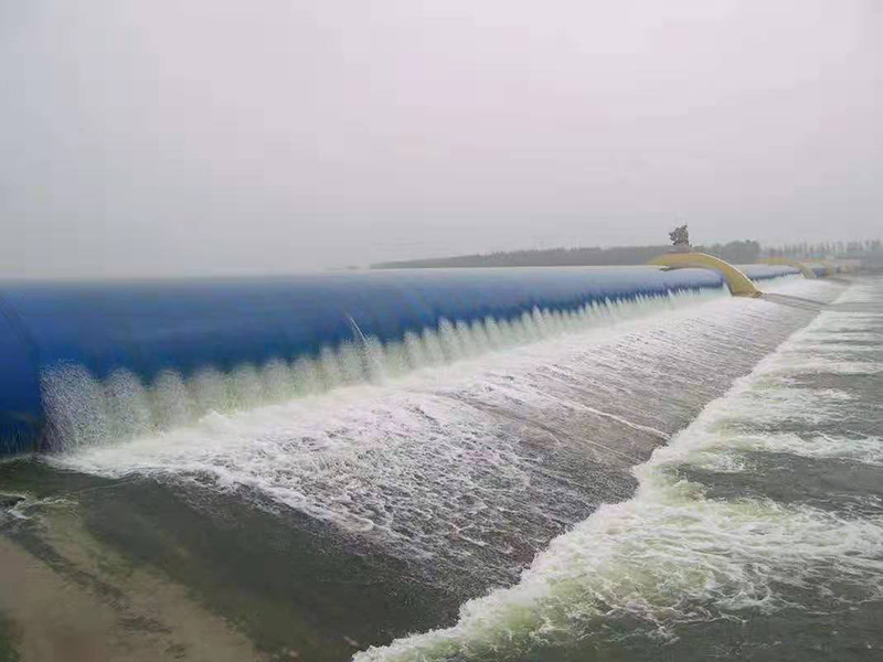 橡膠壩,又稱橡膠水閘,是用高強(qiáng)度合成纖維織物做受力骨架,內(nèi)外涂敷橡膠作保護(hù)層,加工成膠布,再將其錨固于底板上成封閉狀的壩袋,通過(guò)充排管路用水(氣)將其充脹形成的袋式擋水壩。壩頂可以溢流,并可根據(jù)需要調(diào)節(jié)壩高,控制上游水位,以發(fā)揮灌溉、發(fā)電、航運(yùn)、防洪、擋潮等效益。 橡膠壩主要適用于低水頭、大跨度的閘壩工程,如用于水庫(kù)溢洪道上作為閘門或